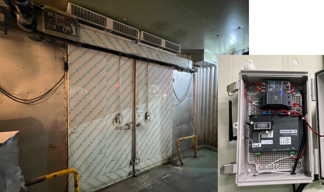 - 별도의 네트워크 공사가 필요하지 않도록, LTE 통신이 지원되는 엣지크로스의 AIoT 디바이스 MODLINK-T2를 기존의 제품보관 창고에 부착했어요.